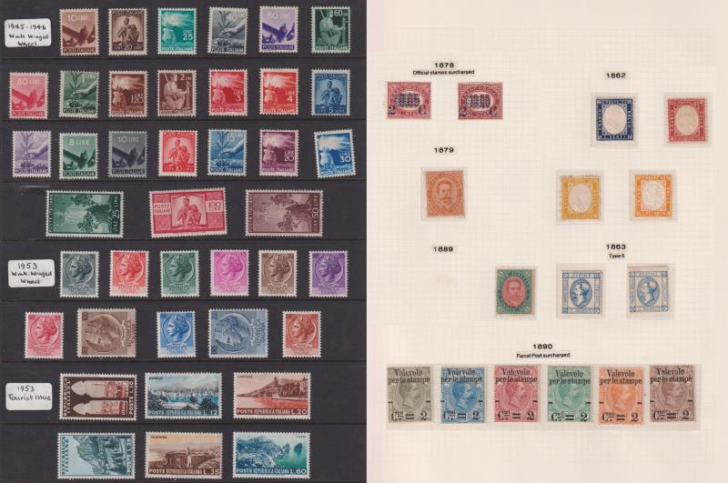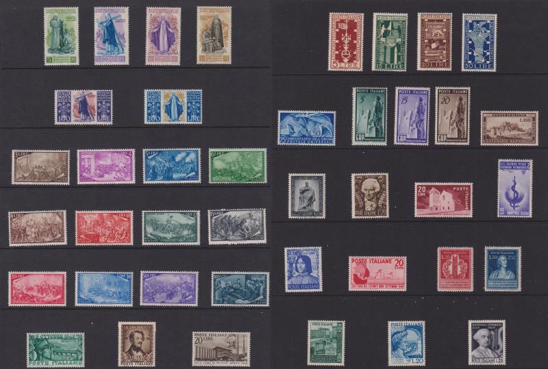 108 M* imageItaly 1945-61 mostly MUH colln of 268v on 13 Hagners, incl better commems, eg: 1948 Revolution Centenary (postage) set MUH, & 1949 Roman Republic Centenary set MUH. Odd one odd sign of light discolouration. SG cat £5000+. (Image)