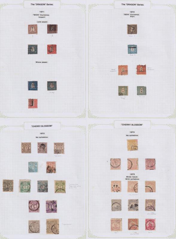 112 / imageJapan 1871-c1990 extensive mostly used colln in 2 multi-ring albums. 1) Contains 13 various perf/imperf Dragons (cat £2,500+); 57 Cherry Blossoms/Bean Geese; 95 Kobans; & 58 Chrysanthemums with shade paper/perf/wmk/syllabic varieties. Then a fairly comp (Image)