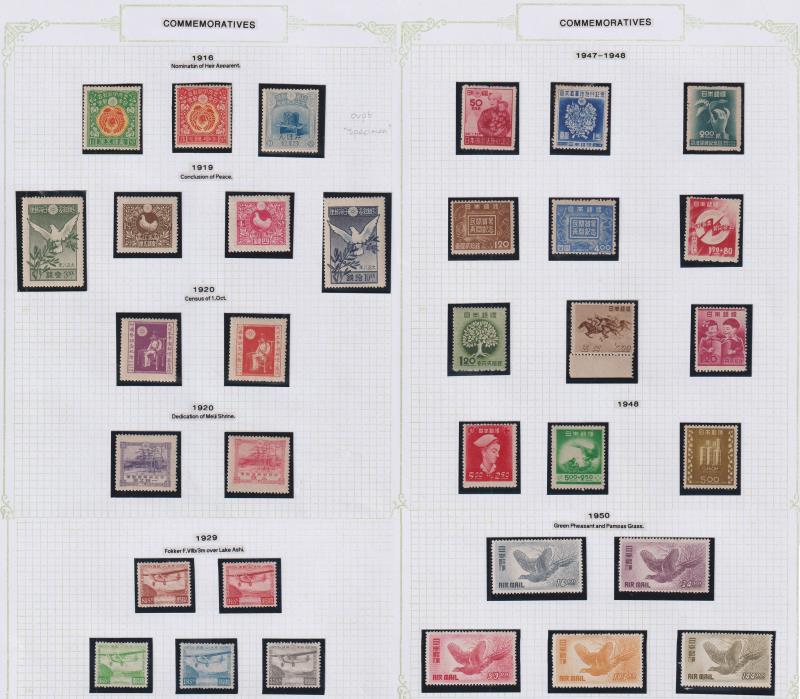 113 M* imageJapan 1876-1993 extensive mint/MUH colln in 2 multi-ring albums. 1) comprises defins & commems commencing with range of Taisho & Chrysanthemum shades etc, & incl 1916 Prince Hirohito’s Investiture set (10s with mihon/SPECIMEN ovpt, SG 191s); 1929, 1950 e (Image)