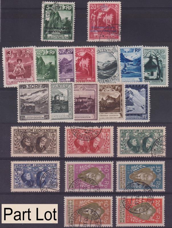 118 / imageLiechtenstein 1912-90s mostly used colln in Davo simplified standard album with slipcase, virtually complete. Noted 1927 & 1929 Prince John sets; 1928 Flood Relief set; 1928 70th Anniv set of 9 FU [top 8 values Marxer cert (2005)]; 1930 Pictorial set min (Image)