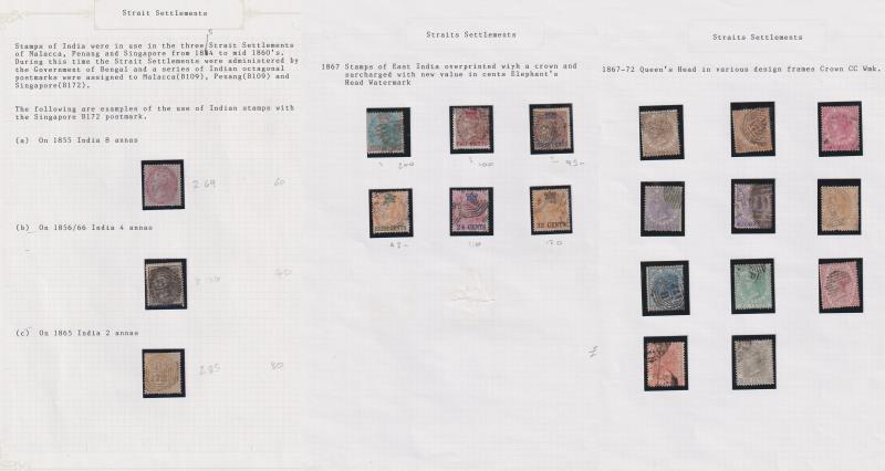 129 / imageMalaya-Straits Settlements, Federated States & Postal Union 1855-1951 colln of 350+ diff mainly used on annotated pages. Noted 3 India stamps with Singapore B172 pmks; East India 1867 1½c, 2c, 3c, 8c, 24c & 32c crown ovpts GU/FU; Straits Settlements 1867 (Image)