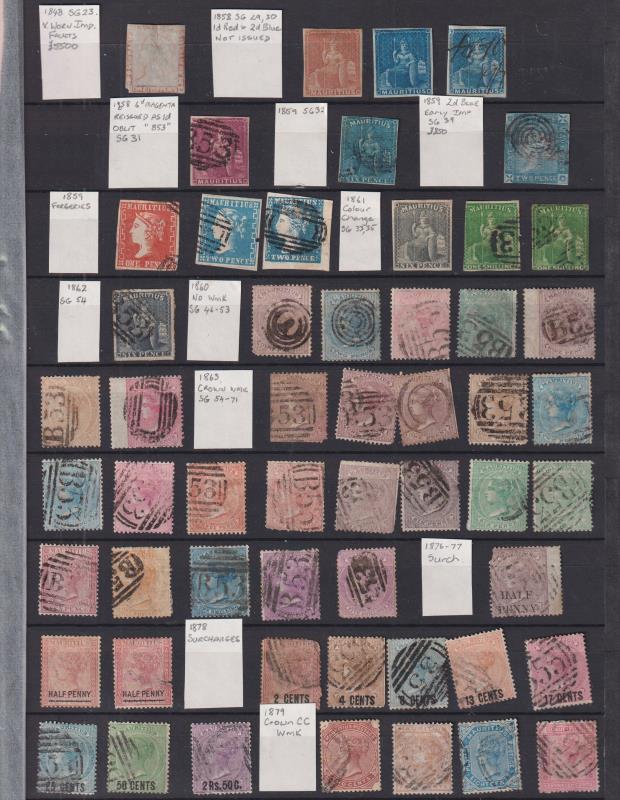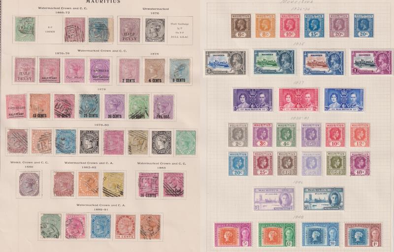 133 / imageMauritius 1849-1950 seln of min t& used on 8 pages. Incl 1878 surcharge set of 9 mixed mint & used; 1886 2c on 38c mint; 1891 2c on 17c mint; 1902 1r GU/FU; 2r50 & 5r mint; 1938 GVI set to 5f mint & 10r FU. SG cat £1450+. (Image)