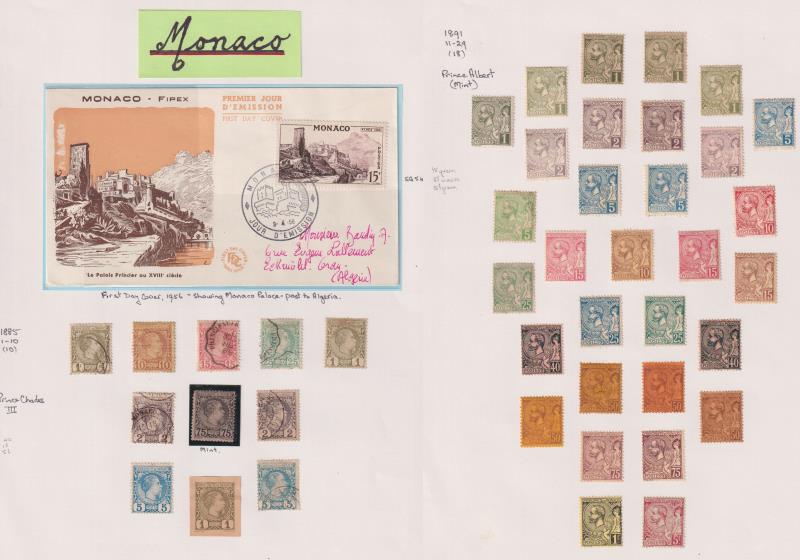 135 / imageMonaco 1885-c1980 attractive mint/MUH/used colln on pages. Noted 1885 75c (SG 8) mint, 1891 good range of Prince Albert to 5Fr mint & used incl 15c bright rose & dull rose (SG 15, 15a) mint. Some dupn. Cat £3600+. (Image)