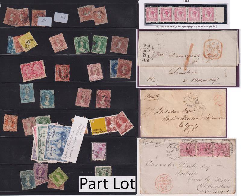 140 C/ imageNew Zealand c1800s accum of philatelic items from the working stock of Dr Ken Markham's gold medal exhibits on NZ history. Noted: extensive material on Chalon designs (incl stamps/m/ss) ex NZ & Brit Empire, & die proof set ex RPSNZ Handbook + 3 (1d, 2d) (Image)