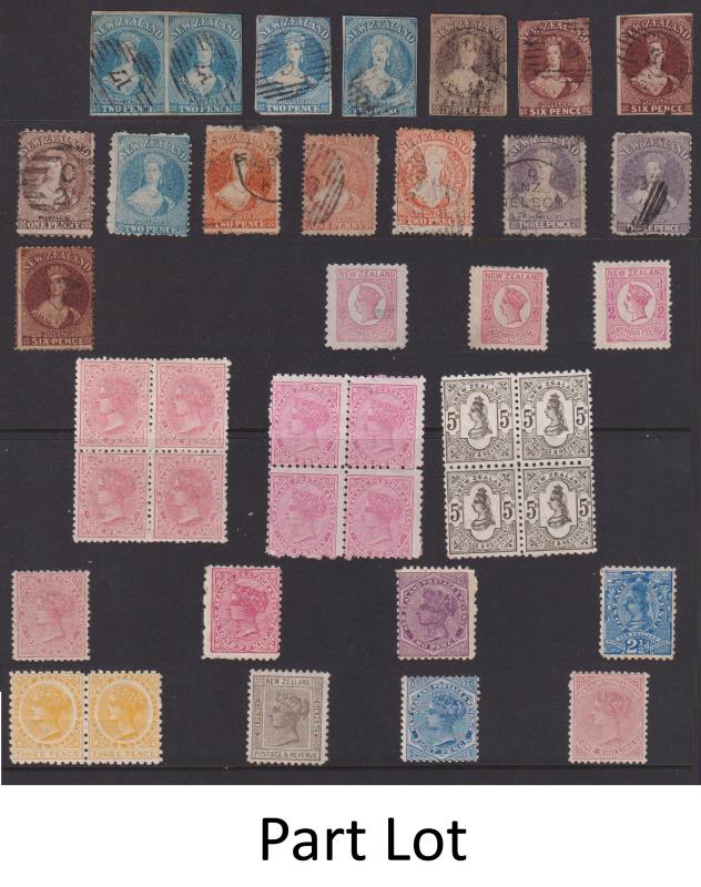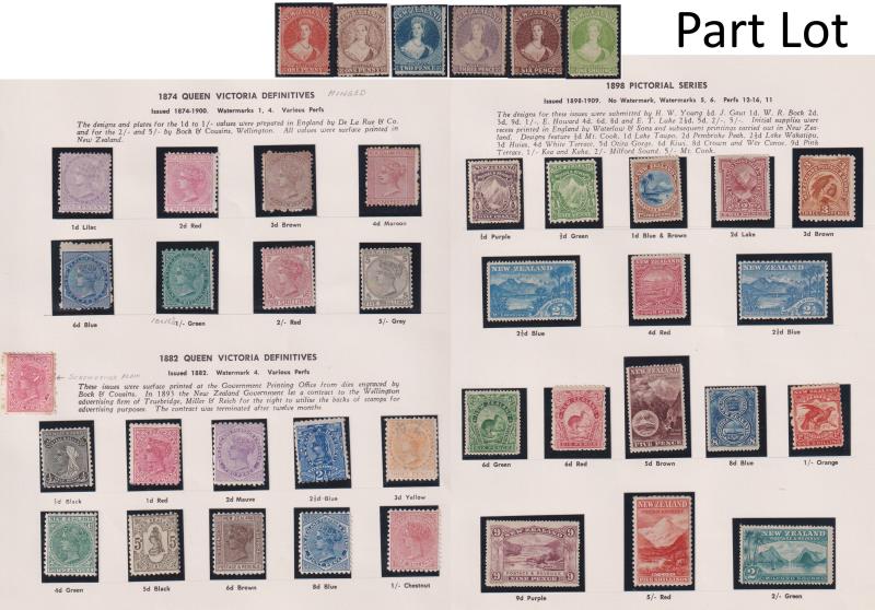 perf 2d pale blue mint; SSF to 8d mint; 1898s Picts mint incl 6d green x 3 & 2/- laid paper; 1906 3d Christchurch Exbn x 2 mint;