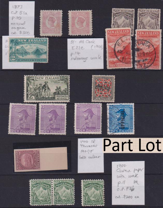 purchased. Noted 1898 2/- Milford, London print (mint); 1906 5/- Mt Cook, p14 FU; 1903 4d Taupo, p14 reversed wmk FU x 2; 1905 Dickie s