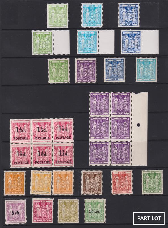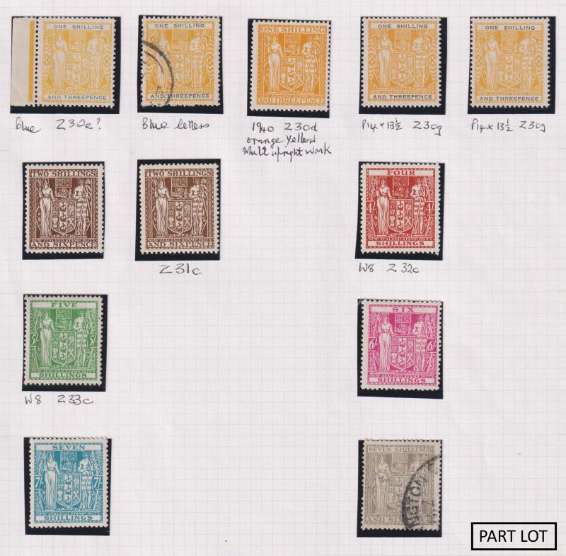 203 / imageNew Zealand c1931-170s Arms Type 60v with some multiples on 2 Hagners: mint 1½d-10/- range & 5/- (horiz) Official, $4-$10. Used 5/6d to £3. Fiscals 3/6d to £300 & 3/- DENOTING. Also, range of GVI & QEII plate blocks of 4 or 6, 1954-63 Officials in blocks of 4, seln of Training School stamps, Postage Dues & Express Delivery on 6 Hagners mint/MUH. (Image)