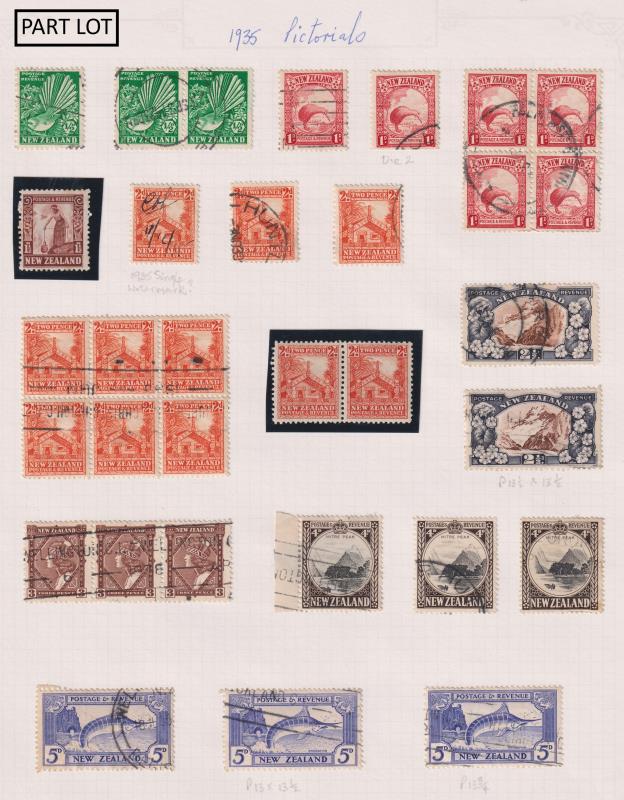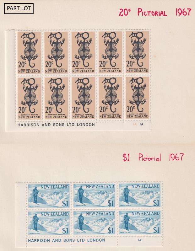 205 / imageNew Zealand 1935-94 mint & used colln on small pages. Noted 1967 Picts 20c, 25c, 30c, 50c & $1 plate blocks mint; 1970-1 Picts annotated pages with plate blks, value blks, coils & flaws (incl 4c Puriri Moth with purple-brown colour omitted & 50c Abel Tasman Park (yellow-green headland & pinkish buff foreshore omitted MUH); 1978 $1 & $2 Shells; 1981 $5 Beehive & 1988 $5 Takahe imprint blks MUH, 1935-38 Health plate blocks x 8 mint. (Image)