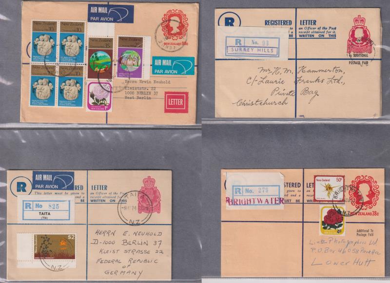 209 C* imageNew Zealand 1960s-70s registered postal stationery envelopes x 39, range of values, designs, pmks etc. Plus 1974 UPU presentation red leather album (with all the then current stamps). MUH. (Image)