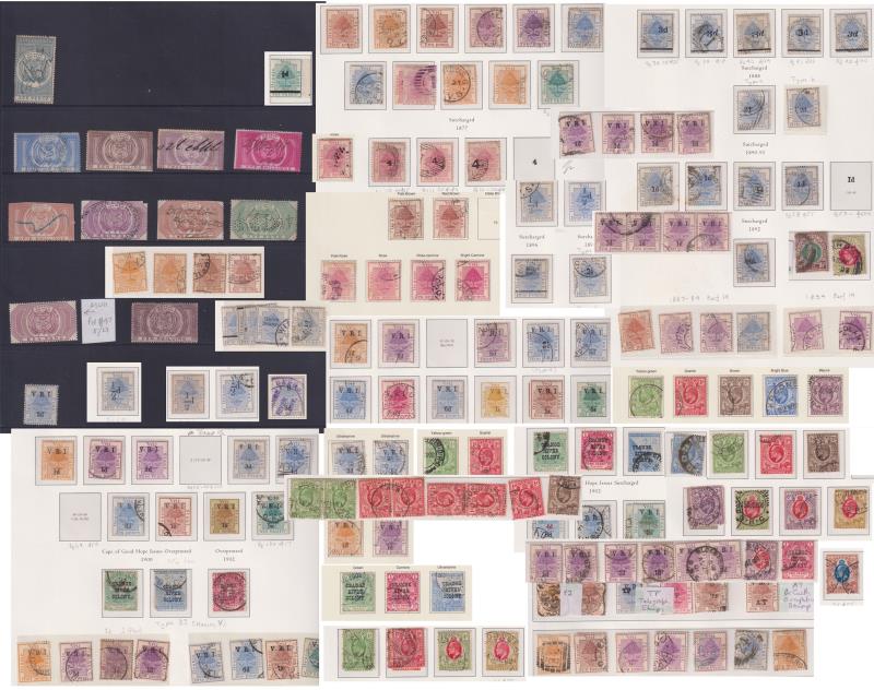 216 / imageOrange Free State 1868-1909 mostly used on hingeless pages. Noted 1877 4d on 6d rose SG 11 GU/FU, 1882 3d on 4d ultramarine x 5 (SG 38-42) GU/FU to FU & 1882 £1 purple fiscal SG F13 MUH. Approx 180 stamps. (Image)