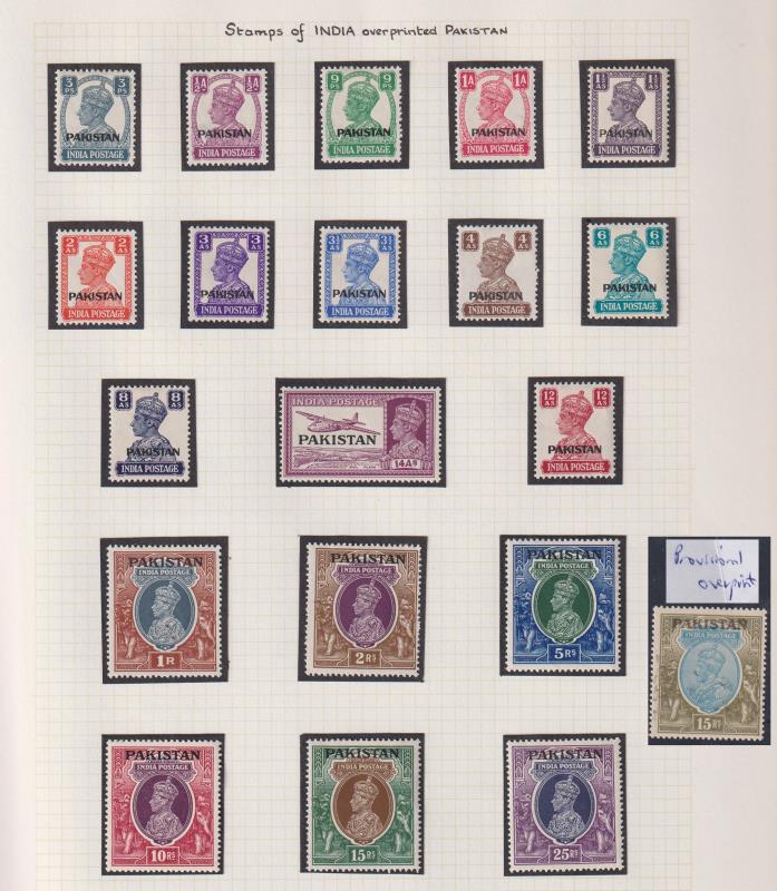 219 M* imagePakistan 1947-2018 near complete colln mainly mint to 1973 & MUH thereafter, in mounts on pages. Noted 1947 Pakistan ovpts set of 19 mint & 15r blue & olive (India SG 218) provisional ovpt, 1948-57 set of 20 plus 10r p12 & 25r p13 & p14 Khyber Pass mint; 1949-53 set of 8 mint & Officials (1947 set of 13 MUH, 1948 set of 13 mint, 1949 set of 5 MUH & 1953 5r MUH). Also incl 13 Hagner pages of duplicates from 1974 not incl in CV. SG cat £3025. (Image)