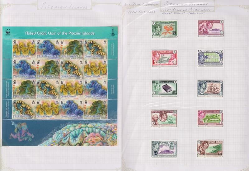 222 / imagePitcairn 2008-17 comprehensive colln of mint & used on pages. Noted 2012 Giant Clam sheetlet of 16 & m/s MUH; 2015 75th Anniv of first Pitcairn stamps mint & used sets; 2016 Petrel set mint & used/CTO & m/s MUH; 2016 Ferns set & m/s both mint & used/CTO. Also incl 10 diff FDCs. SG cat £1350+. (Image)