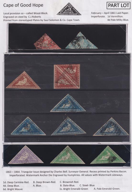 231 / imageSouth African Provinces c1853-1900s stamps & revenues collns on extensively annotated pages incl: CGH noted 22 triangulars (mixed cond) plus 7 forgeries, total about 170 stamps, about 400 revenues (plus 8 documents); 16 postal stat items & 3 sepia WWI p/cs (NZ troops); Griqualand: 8 stamps & about 40 revs; Natal: 1869-c1908 about 75 stamps, noted 1899 5/- QV carmine mint; Orange Free State/River Colony: 1868-1900s about 150 stamps & 50 revs (+ document); Transvaal 1870s-c1904 about 200 stamps, noted 1900 Lydenburg 3d on 1d mint & 10 Pietersburg, EVII to £1 (10/- mint, £1 Specimen ovpt & about 25 early Arms all appear to be reprints). Plus about 80 revenues, 3 documents & 3 p/cs. (Image)