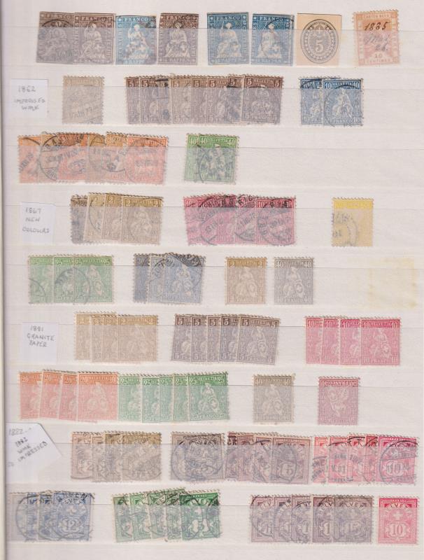 234 / imageSwitzerland c1845-c1950 colln/seln in large s/b, mix mint & used. Starts with 40+ Cantonals etc incl Rayon II on cover (pre 1854), most appear to be reprints etc except incl 1850 2½rp red & black unused with Zumstein cert (1989); 35+ imperf Standing Helvetia incl 2f grey (about 3 margins); c1862 Sitting Helvetia about 40 incl 1f x 4 used; good range Pro Juventute incl 1915 10c & 1941 m/s FU & MUH; m/ss incl 1940 Fete x 2 MUH; 1945 Pax sets FU & mint; plus many other useful items. High cv. (Image)