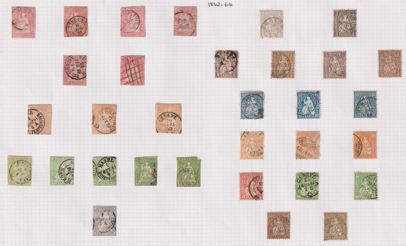 238 / imageSwitzerland 1854-1905 comprehensive mint & used colln on 22 pages. Noted standing Helvetias (incl 1856 1f grey-lilac FU, 1862 2r grey FU x 2), sitting Helvetias (incl 1863 1f bronze-gold FU, 1881 granite paper 1f gold FU), numerals incl 1882 impressed wmks 2c olive-bistre & 15c orange-yellow GU/FU, the latter with cert), standing Helvetias (1888 p9½ 40c grey & 50c blue FU, 1901 p11½ x 12 1fr claret FU). SG cat £16,000+. (Image)
