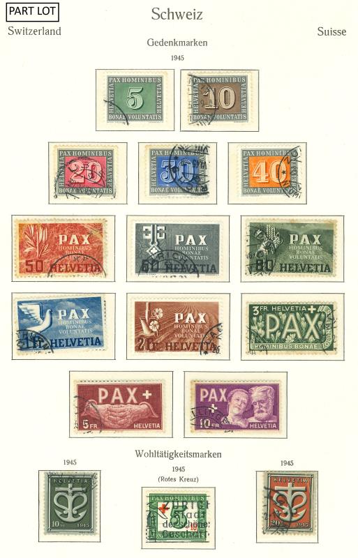 239 U imageSwitzerland 1854-1959 mostly complete specialised virtually all used colln in hingeless Kabe album with slipcase. All the spaces for Cantonal issues etc filled but all appear to be forgeries etc. Good range Sitting & Standing Helvetias, Numerals, Tell/Helvetia with Shield etc; Pro Juventute appears complete except 1915 5c; Airs appear complete; all m/ss noted 1934 NABA (selvedge thin); 1936 Pro Patria; 1945 Peace set (10f minor tone). STC 8500+DM in 1989 but some items (incl nearly all Cantonals) not counted incl group of 4 c1882 25c Sitting Helvetia imperf colour trials. (Image)