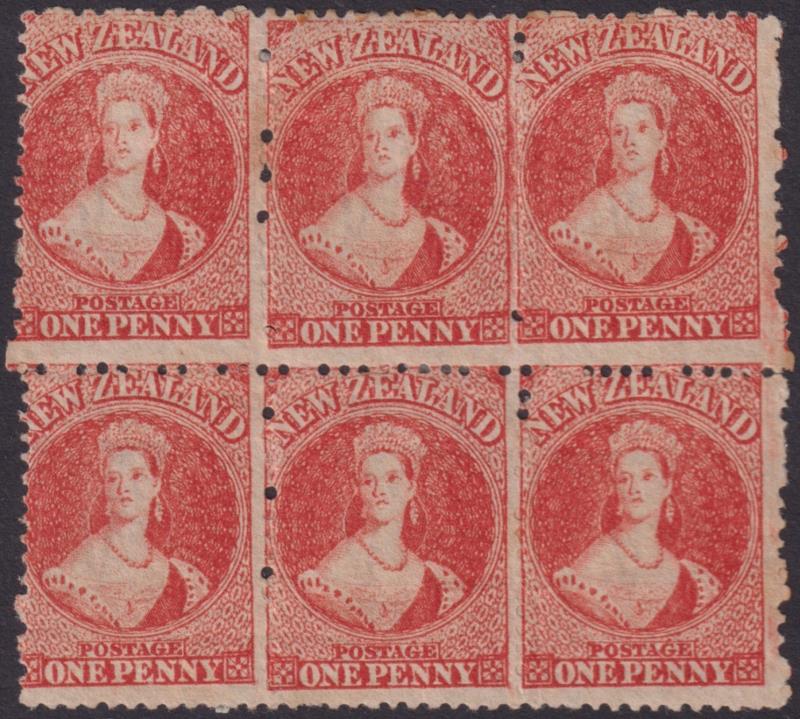 1d carmine-vermilion horiz block of 6, star wmk, a few tone spots & diagonal crease on bottom 3. Some hinge reinforcement.