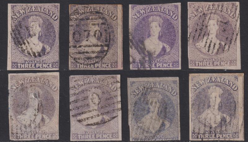 3d lilac x 7; 3d mauve all accidental imperfs, mostly about 3 margins incl 1 or more good to large (1 with minor toning,