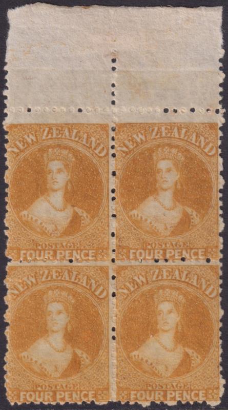 4d orange-yellow top selvedge block of 4, no wmk. SG 139. Cat £1200. Mint. (Image)