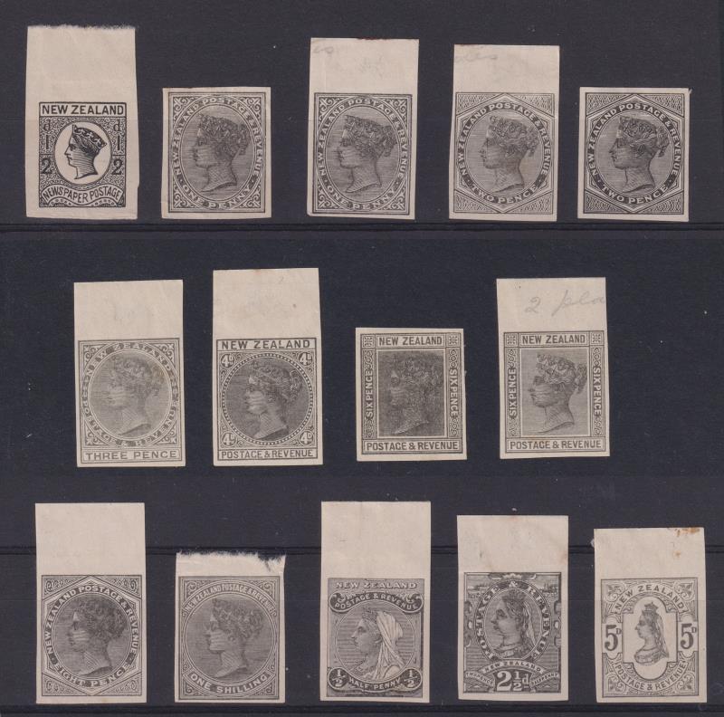c1900 official reproductions imperf in black on umwmkd paper set of 10 (incl 1d, 2d & 6d each x 2 dies) & ½d Newspaper. (Image)
