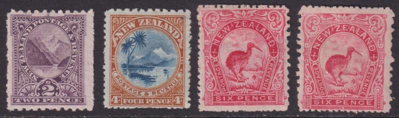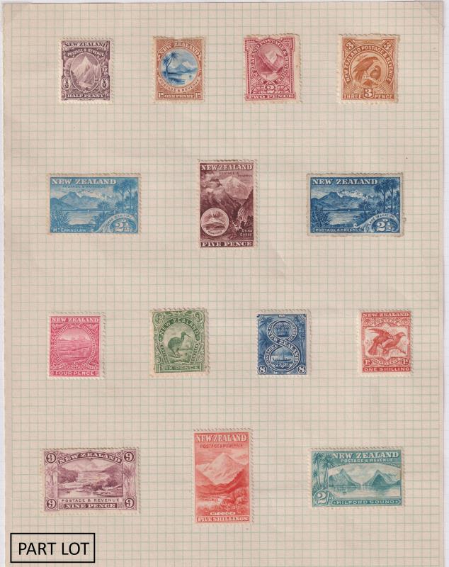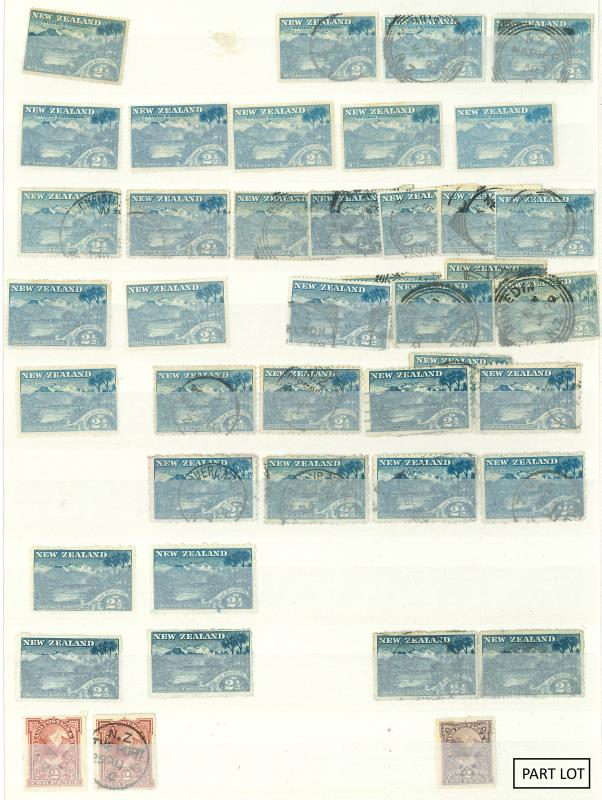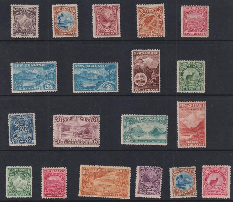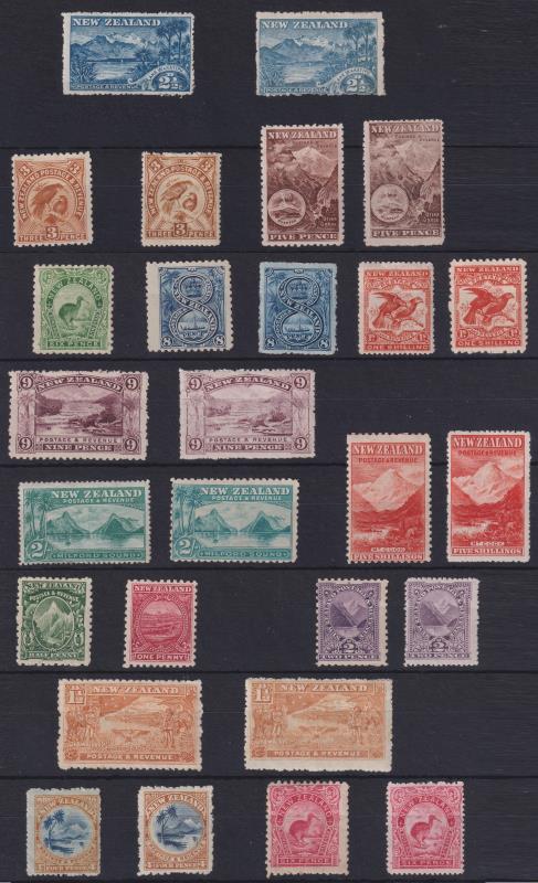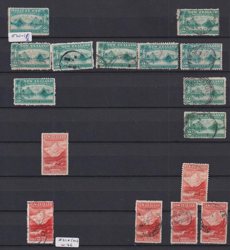 1898 "London prints" 5d Otira sepia mint, 2/- Milford mint x 3 & 5/- Mt Cook x 2 mint & FU; 1899 5/- Mt Cook p11 no wmk GU/FU; 1900 3d Huias p11 no wmk blk of 4 MUH; 1903 2½d Wakatipu p11 reversed wmk mint, 9d Terraces p11 reversed wmk FU, 2/-