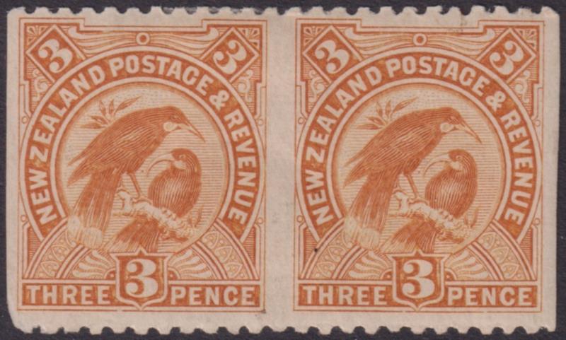 1899 3d Huias horizontal pair, imperf vertically p11, no wmk. SG 261b. Cat £750. Mint. (Image)