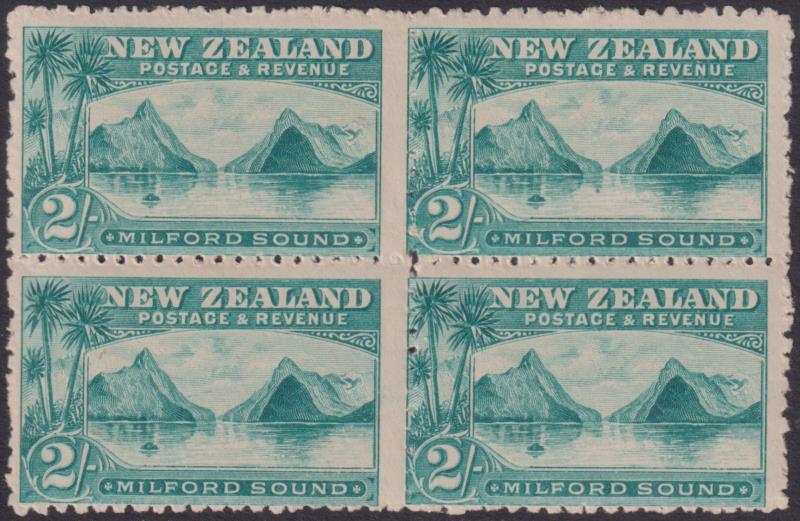 1899 2/- Milford blue-green block of 4, p11, no wmk, very faint gum tone. Ex Baillie. SG 269. Cat £1000. Mint. (Image)
