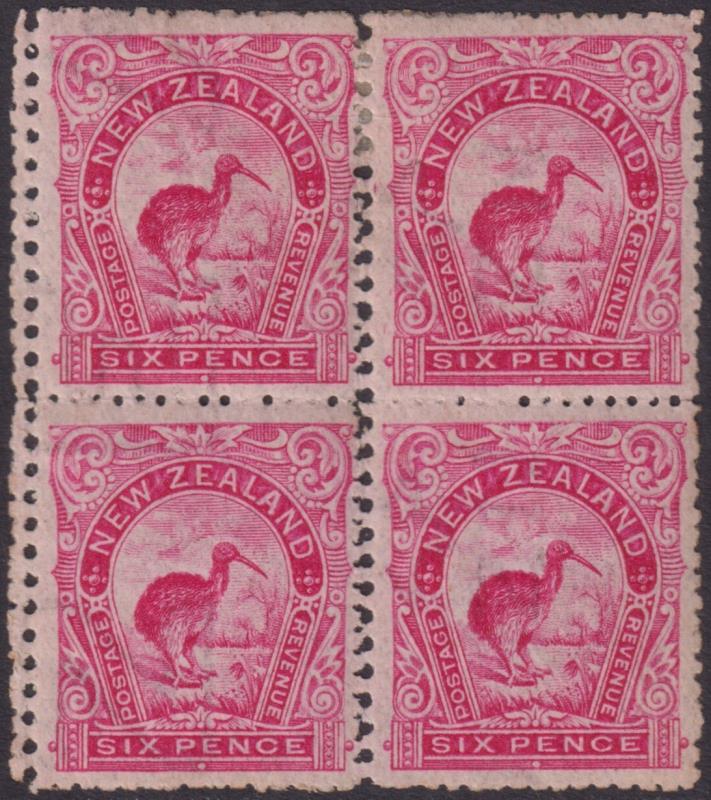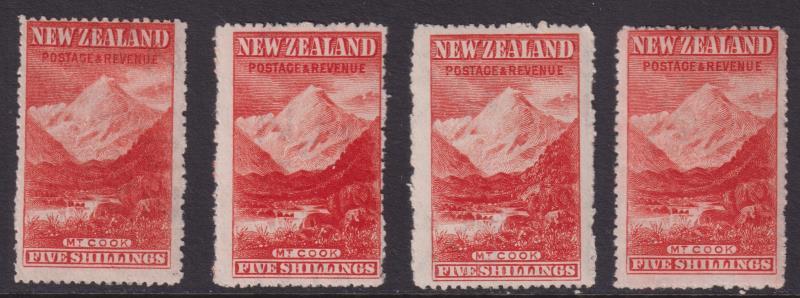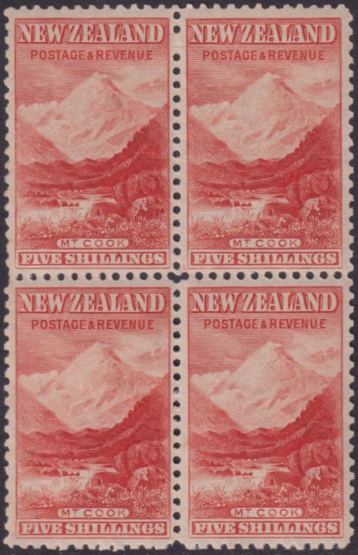 1899 5/- Mt Cook vermilion block of 4, p11, no wmk. SG 270. Cat £1700. 3 mint/1 MUH. (Image)