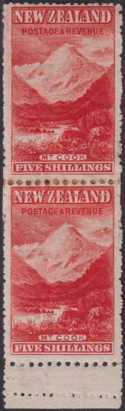 1906 5/- Mt Cook vermilion vertical pair, upright wmk, with sheet margin at foot. Mixed perfs, patched at centre. A very rare