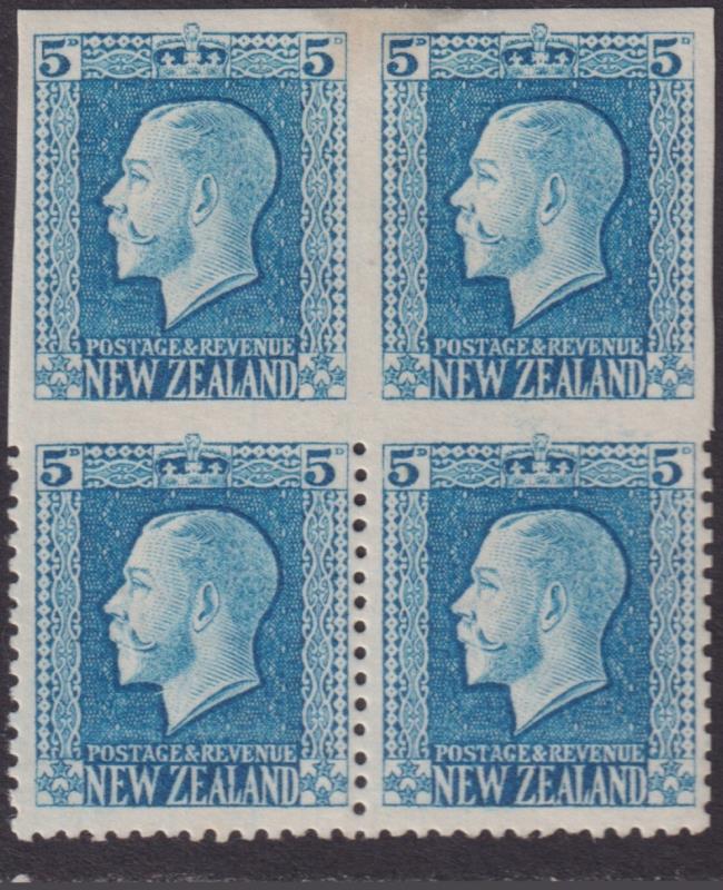 482 M image1922 5d blue vertical pairs in block of 4, p14 x 13¼, Cowan, upper stamp imperf & lower stamp imperf at top x 2. Faint hinge stain to front. CP K7a(x). Cat $4,000. Mint. (Image)
