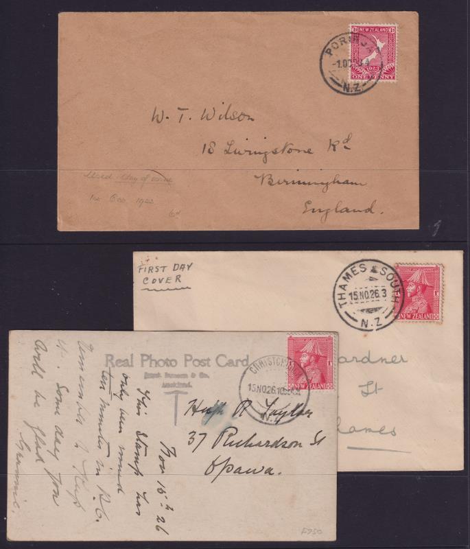 483 C image1923 1d Map plain FDC (to W.T. Wilson in GB), canc neat Porirua cds 1 OC 23. Also 1d Field Marshal plain FDC canc fine Thames South cds 15 NO 26 (cover bend) & FM PPC canc clear Christchurch cds 15 NO 26. All fine. Very scarce trio. Ex Horrell. CP cat $2050. (Image)