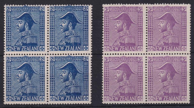 485 M* image1926 2/- & 3/- Admirals blocks of 4, Jones paper, invtd wmks, each 2 stamps with part letters wmks. Each lower pair unhinged (1 mint 3/- letter wmk small gum tone spot). CP K20az, K21az. Cat approx $3250. Mint/MUH. (Image)