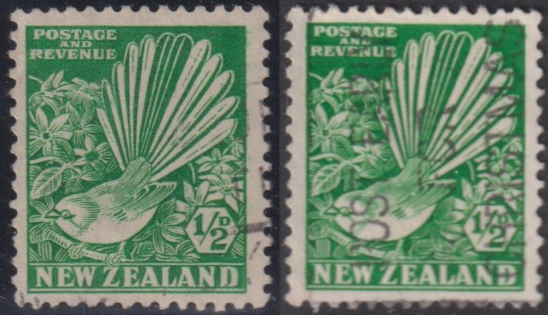 490 U image1935 ½d Fantail, clematis flaw (R8/1), single wmk paper. RPSNZ cert (2022). Although the clematis flaw is common on the multiple wmk paper, it is very scarce on the single wmk paper, this is a recent discovery. CP L1au. Cat $1750. VFU. (Image)