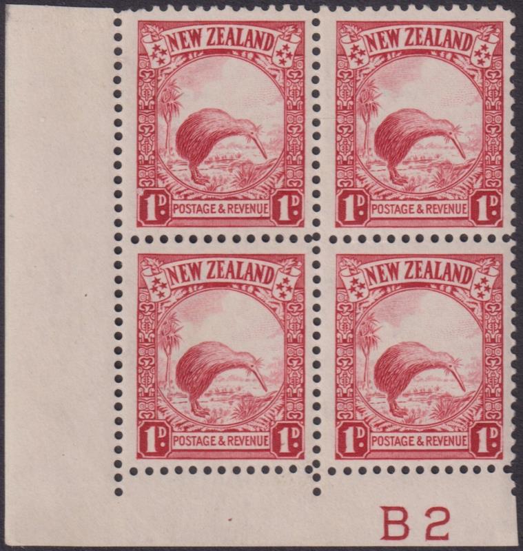 491 M image1936 1d Kiwi lower left plate B2 block of 4, p13½ x 14, single wmk, die I, 2 short perfs. Scarce. CP L2b. Cat $2000. Mint. (Image)