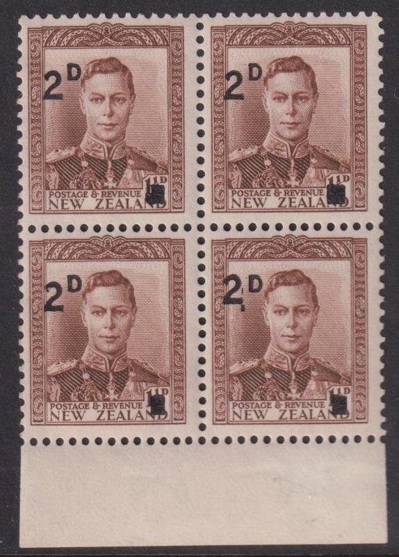 494 M* image1941 2d on 1½d provisional ovpts chocolate block of 4, with bottom sheet selvedge, incl R10/10 surcharge variety "reinserted 2". Fine example. Left 2 stamps mint, right 2 (incl variety) MUH. Ex Musgrove. CP M5a(z). Cat $1650. (Image)