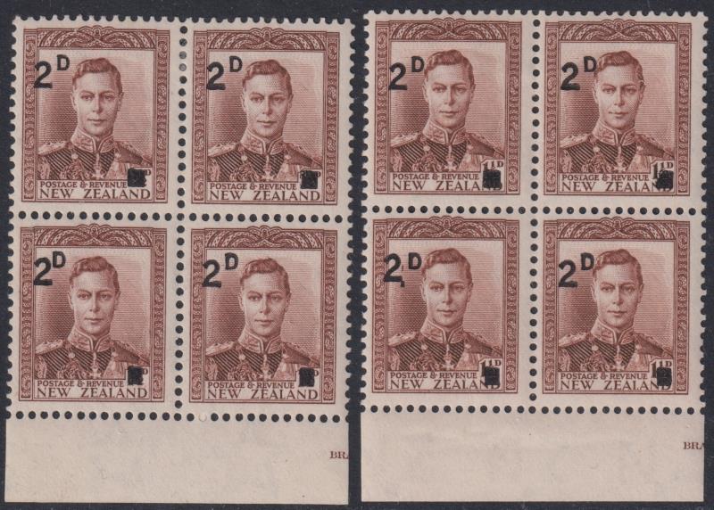 495 M* image1941 2d on 1½d provisional ovpts blocks of 4 x 2, each showing different positions of the re-inserted "2" in 2nd overprinting of R10/10. Hinge marks on top 2 stamps of each block. CP M5a(z). Cat $3300 (as MUH). Mint/MUH. (Image)
