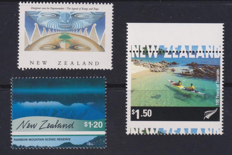 544 * image1990-2001 errors: 1990 40c Legend, missing chalky blue colour (cat $850); 2000 $1.20 Scenic Reflections, misperfed resulting in sky appearing at foot of stamp (cat $750); 2001 $1.50 Tourism Centenary misperfed resulting in part of NEW ZEALAND appearing in upper selvedge (cat $500). MUH. (Image)