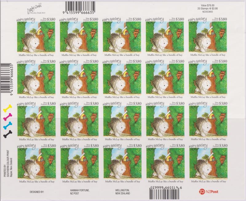 550 * image2023 $3.80 Hairy Maclary - Muffin McLay complete sheet (20v) imperf. Vendor acquired this amongst 5 sheets required for postage, ex Mayfair PO in Hastings - the others are normals. (Image)