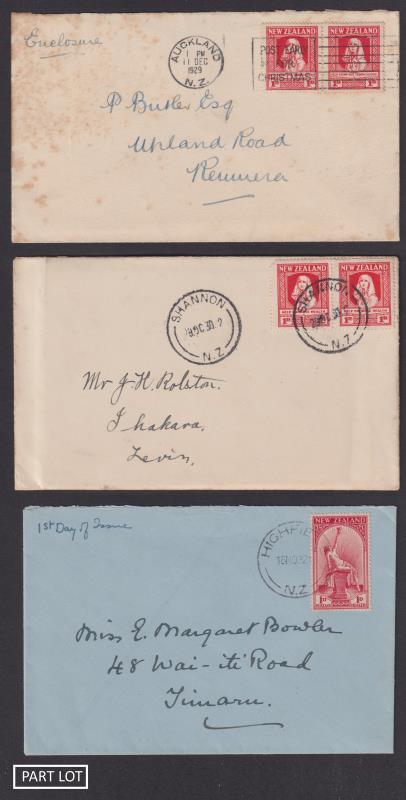 552 C image1929, 30, 32-34 hand addressed plain FDCs. 1934 cover has 26 OC 34 Port Nelson cancel, this being the first day of issue outside Wellington (a cause of vociferous complaint from collectors at the time). Fine condition except 1929 cover which is toned and has back flap missing. Cat $3000. (Image)