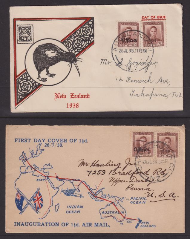 605 C image1938-41 ½d-1½d GVI FDCs x 9 diff (4 printed O.H.M.S. covers, 5 Philatelic pictorial cacheted covers with official stamp adjacent to matching regular stamp). Noted ½d green 1 MR 38 x 2 diff; 1d red 1 JL 38 x 3 diff; 1½d chocolate 26 JL 38 x 3 diff incl nice pictorial (flight map) airmail to USA; 1d green 10 JL 41. Scarce lot. All fine. CP cat $1800. Ex Horrell. (Image)
