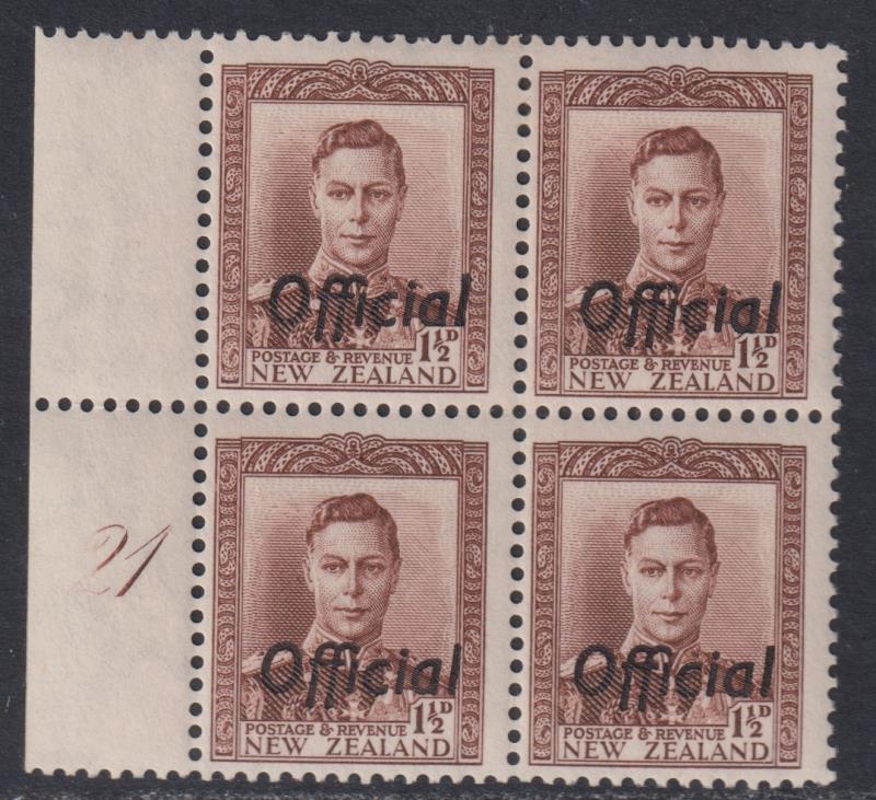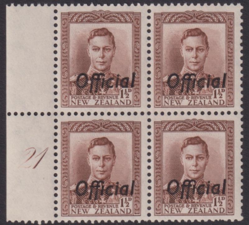 607 * image1938 1½d GVI chocolate plate block of 4, no. 21. CP MO4a. Cat $1100. MUH (L/H selvedge). (Image)