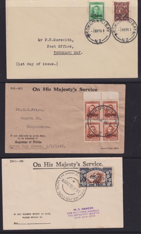608 C image1938-46 FDCs x 3: a) plain cover (typed address) with 3d Wahine & ½d GVI green (faint perf tone), canc Tokomaru Bay cds 1 MR 38; b) 2½d Mt Cook (CP LO5c) canc Palmerston North cds 26 JL 38 on OHMS cover; c) ½d GVI chestnut block of 4 on OHMS cover canc Waipukurau cds 1 JE 46. All fine. Ex Horrell. (Image)
