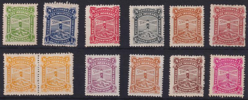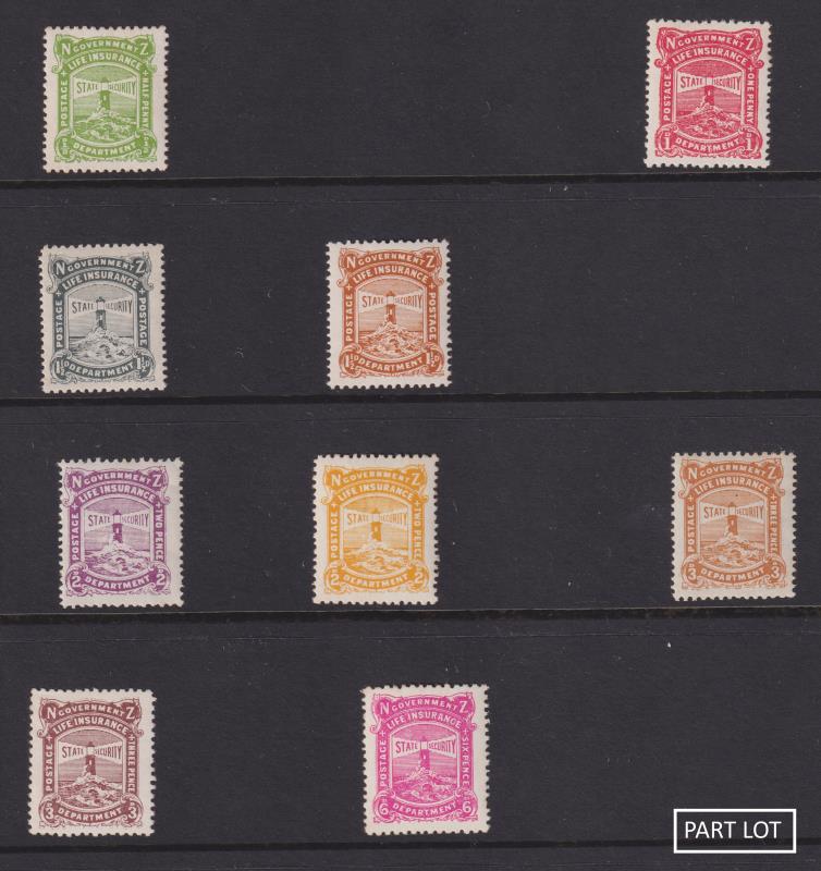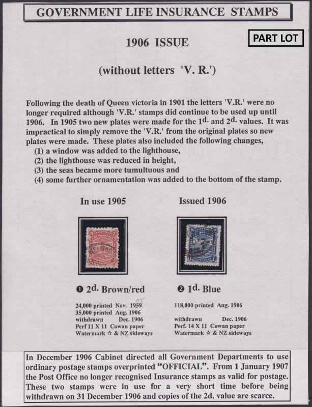 621 / image1905-1947 seln of 126 used & 55 mint "no VR" in mounts on 33 Hagner pages. Noted 1905 2d brown-red FU; 1925 6d Cowan p14 MUH; 1937 2d yellow p14 invtd wmk FU; 65 annotated mostly unlisted flaws (but incl 1946 3d chocolate p14 x 15 R7/11 "HREE" flaw as part of horiz pair mint & R2/4 "INSIIRANCE" flaw FU); & 1 AU 47 last day cover. Cat $3450+. Also incl JW Brodie's 1988 "A History of Government Life Postage Stamps", 160pp book. (Image)