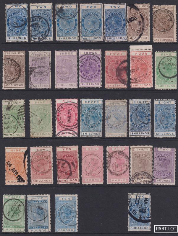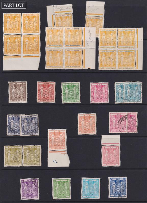 631 / image1882-1925 seln of 29 mint & used on s/b page. Noted 1895 2/6d p11 upright wmk mint; 1901 2/6d brown Counterpart back thin, MNG; 1906 7/6d p14 sideways invtd wmk, corner thin & crease, mint; 1903 10/- maroon p11 sideways invtd wmk mint. Also incl 7 stamps with fiscal cancels. Cat $5500. (Image)