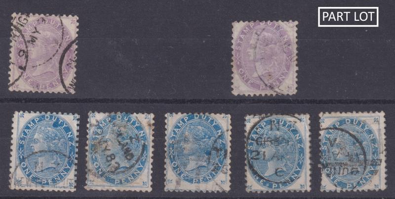 629 C image1878 1d Stamp Duty lilac x 2 used (1 with part PARCELS cancel) & single remaining on part cover to Woodville, ex Wellington 9 June 1890. Also c1883 1d QV blue x 5 GU/FU. (Image)