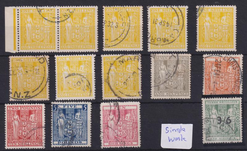 with top selv MUH, 30/- mult wmk x 2 LH mint & FU, £3 green mult wmk FU, £4 single wmk FU, 11/- on 11/- single wmk FU & mult wmk x 2 MUH & mint. CP cat $5450. (Image)