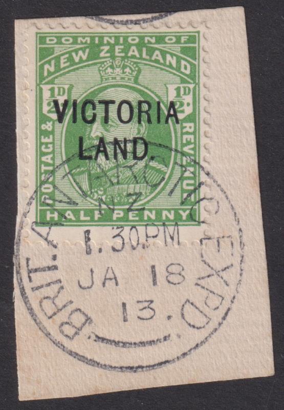 724 U imageVictoria Land 1913 ½d on piece, pmk "Brit Antarctic Expd JA 18 13" (FDI). Jury cat $2250. FU. (Image)