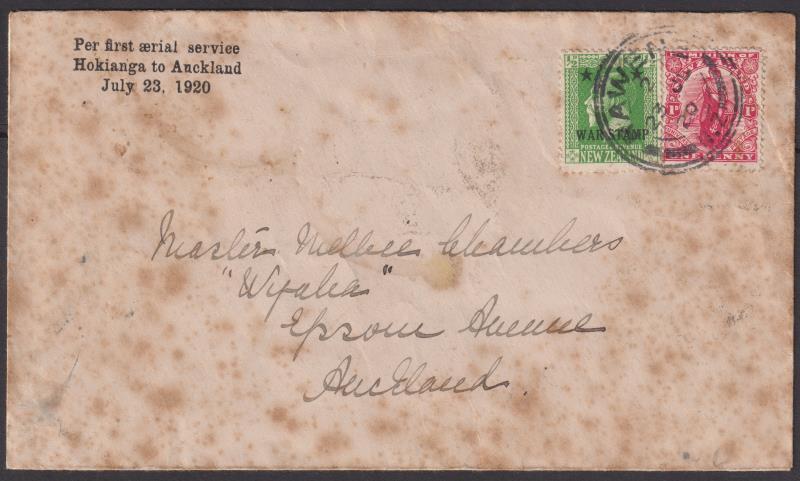 727 C imageNZ 1920 Rawene-Auckland with "Per first aerial service Hokianga to Auckland July 23, 1920" cachet and 1d Dominion & ½d War Stamp with Rawene cds. Cover in poor condition with toning on front. NZAMC 22f. Cat $1500. (Image)