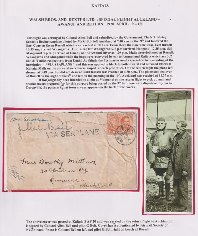 728 C imageNZ 1920 (9-10 April) Pioneer Airmail Kaitaia-Auckland rather crumpled cover (with repaired tear), franked 1½d Victory canc Kaitaia A-type cds 8 AP 20. With h/s "VIA SEAPLANE", m/s "Per aeroplane", & signed "G.B. Bolt" (pilot) & [Col.] "Allen Bell" (charterer of this flight). With photo of the 2 men & plane. Ex J Baird. NZAMC 15f. Cat $1500. (Image)