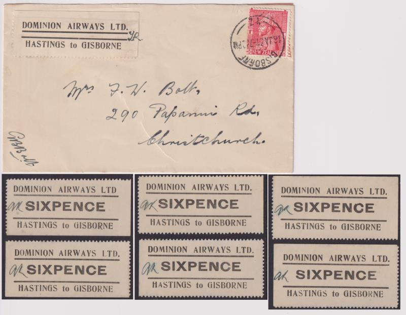 729 CM imageNZ 1930 "Dominion Airways Ltd" labels x 6 - complete (ie: not excised) & inscribed "Hastings to Gisborne", each initialled. All 6 plate positions (as edges of sheet not perfed). Also Gisborne-Napier cover with excised label (Gisborne 16 JA 31 pmk) NZAMC 39d. ACS X69. Cat $1800. Mint. (Image)